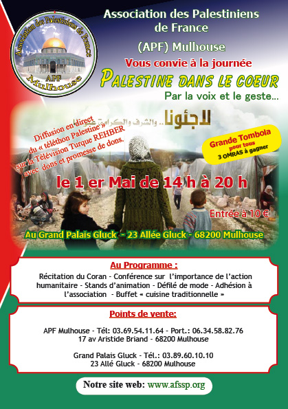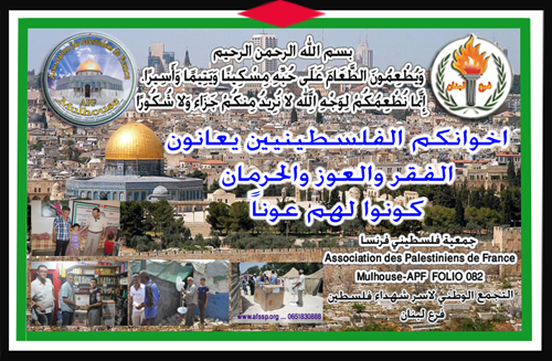 Nous vous souhaitons la bienvenue sur le nouveau site de l'Association des Palestiniens de France à Mulhouse. Notre association travail pour apporter de l'aide aux réfugiés Palestiniens au Liban ainsi qu'en S